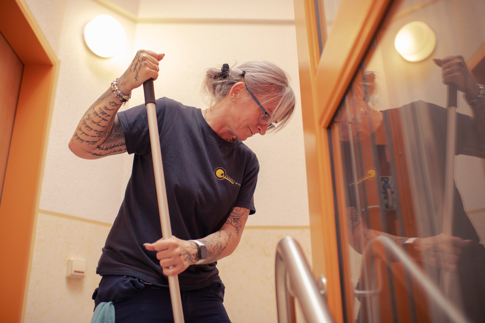 Die Gebäudereiniger sind bei uns im Bauhof West eine eigenständige Abteilung und treten, im Unterschied zur Abteilung Hausmeisterdienste, dort in Aktion, wo in Gebäuden frei zugängliche Räume wie z. B. Treppenhäuser zu reinigen sind. Ein wichtiges Feld ist bei uns die Bau- und Bauendreinigungen. Zunehmende Bedeutung erlangte in den letzten Jahren auch die Reinigung von Fenstern und Glasflächen.